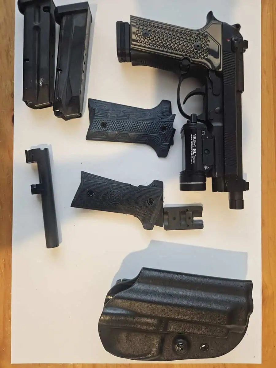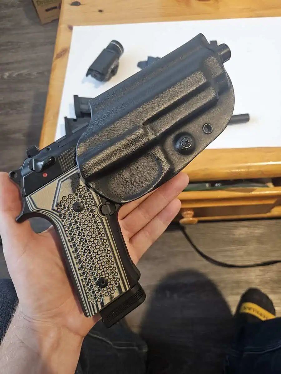 – OSH g code holster (need to take the light off to use it). Is optic compatible. Filed a little bit of material away to let the threaded barrel fit.