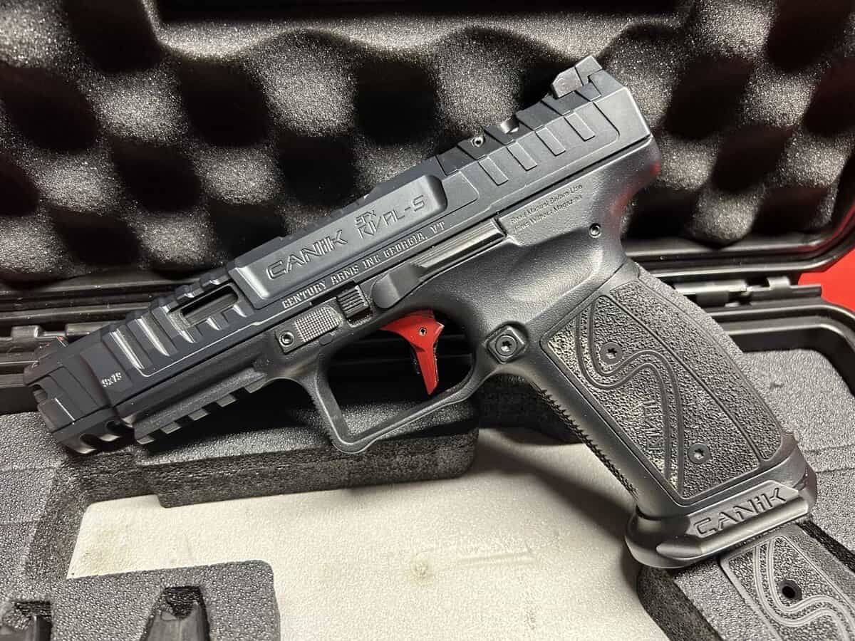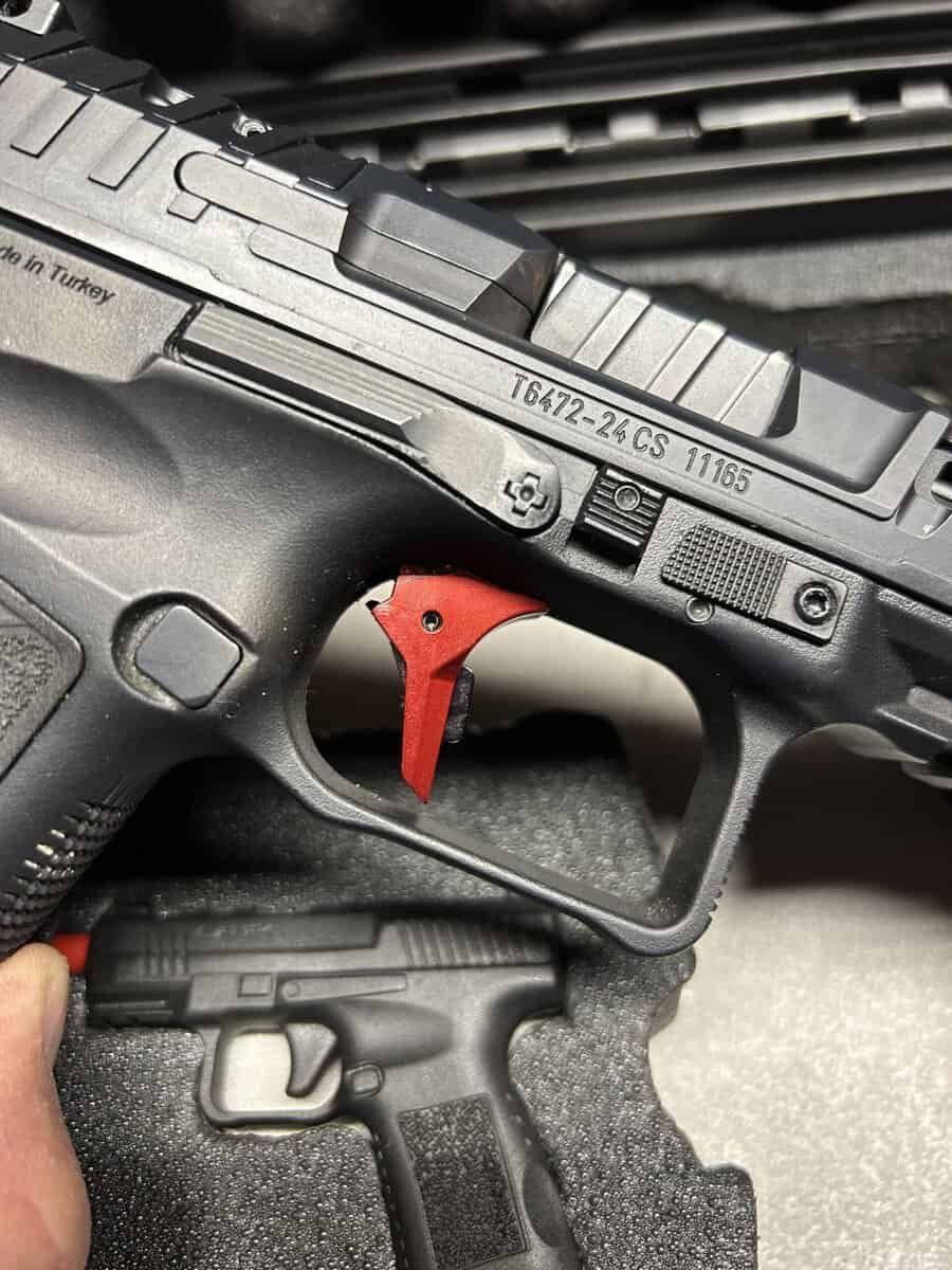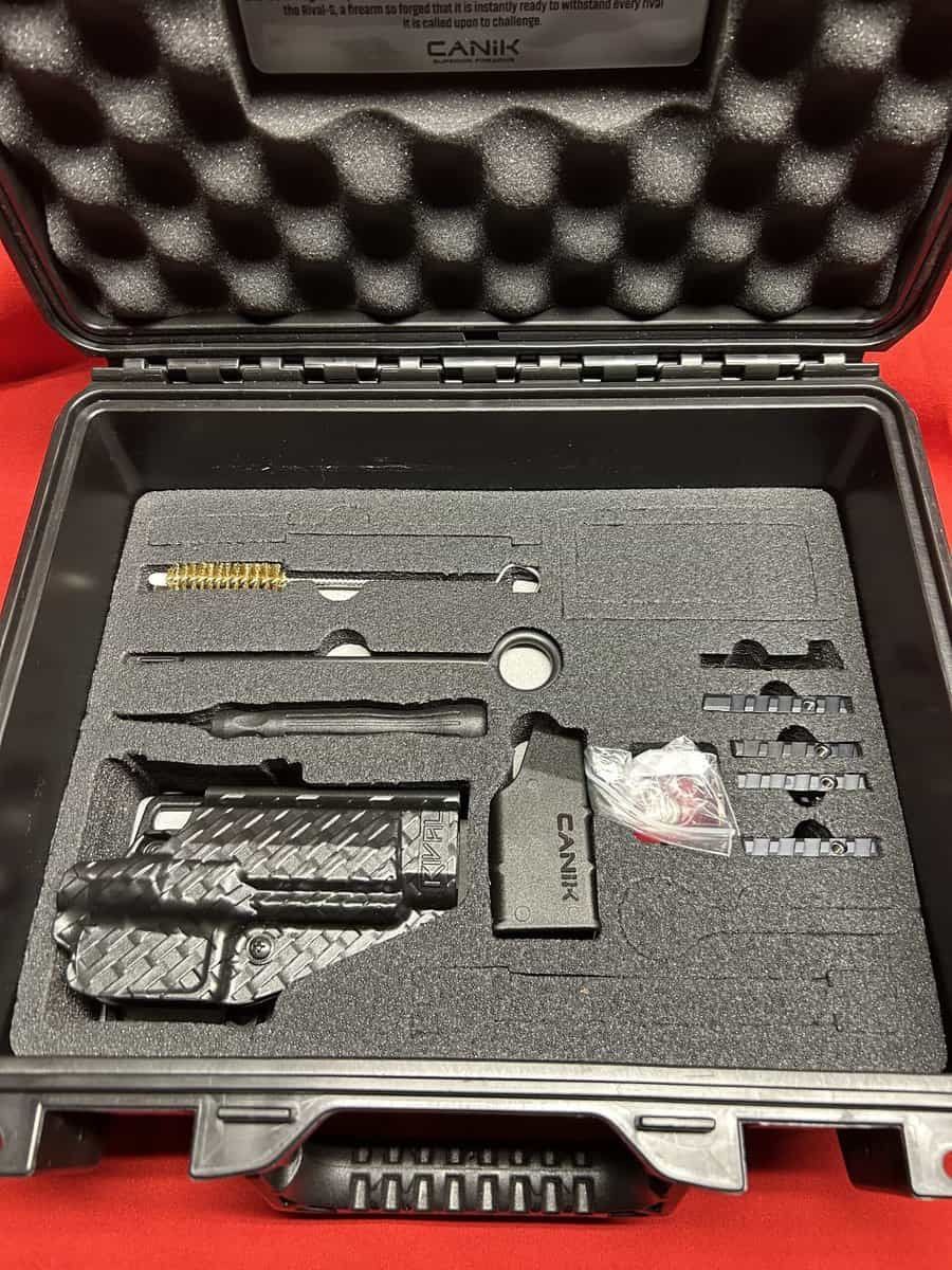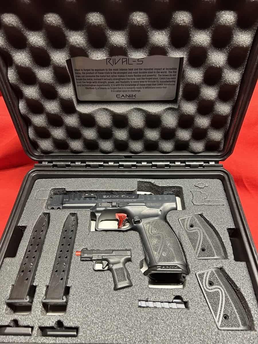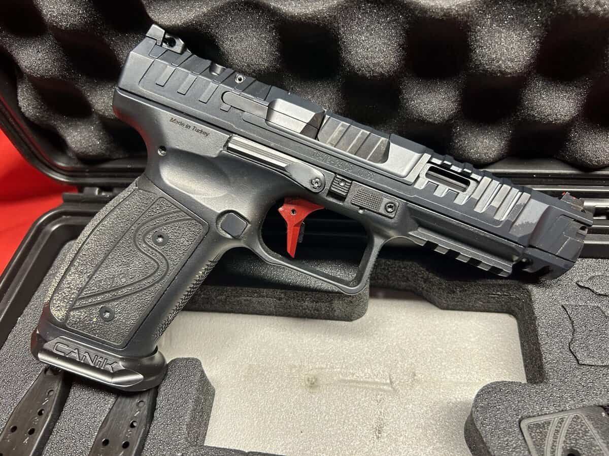 with adjustable fiber optic iron sights in great condition. Has upgraded Freedomsmith trigger. It will come in the original box with two 18-round mags, 3 backstraps, aluminum optics plates, holster, speed loader and tools.