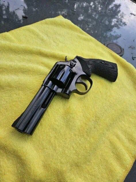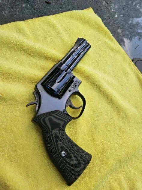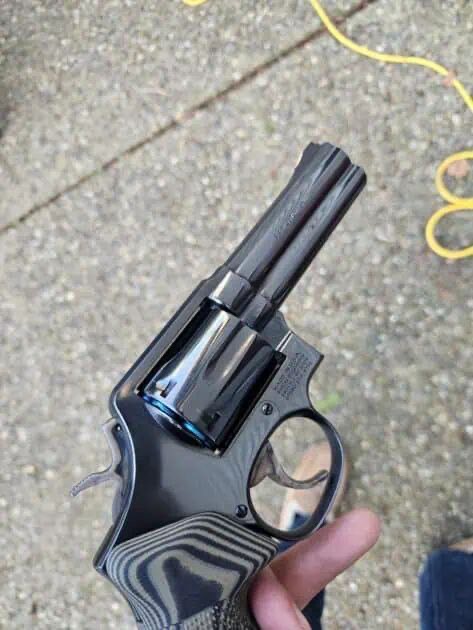 Smith & Wesson 581 (no dash), rare model similar to the 586 but with fixed sights. The revolver is in excellent condition with immaculate bluing and tight cylinder lock-up. The factory recall work on the firing-pin area has been completed. When cocked very slowly, the cylinder is slightly out of time, but two gunsmiths say it’s not an issue during normal operation. A new hand fitting would cost about $165 at Cylinder & Slide if desired. Comes with aggressive VZ grips.Â